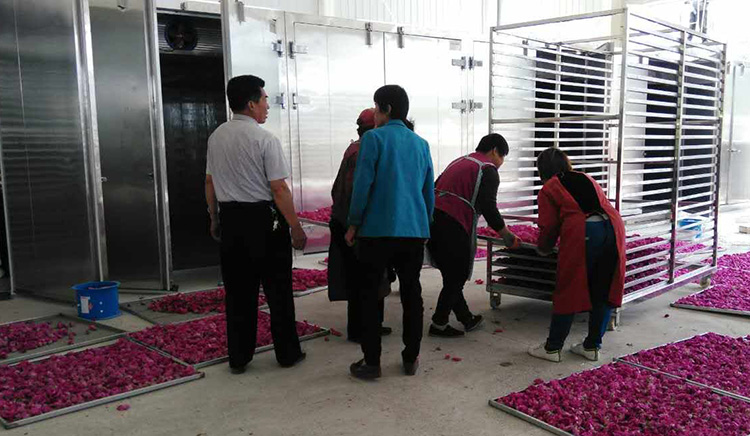 該項目以6P烘干除濕一體主機帶25立方烘干房作為標準型號,一批次可以放入鮮花蕊1800斤左右。整個烘干房可以裝入8臺物料車,每臺物料車分12—14層,層間距約為8—12厘米。物料車須使用304不銹鋼篩網,避免對物料造成生產污染。