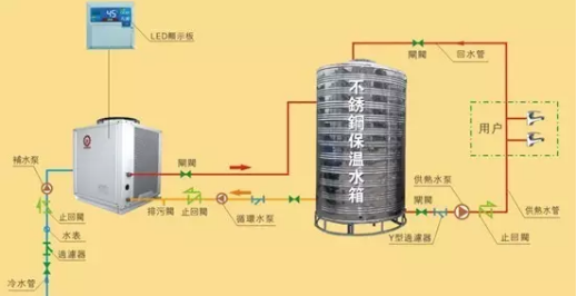 該項(xiàng)目計(jì)劃水箱和機(jī)組安裝在樓頂,冷熱水管在路面與客戶水管對(duì)接。熱泵熱水系統(tǒng)主要由熱泵熱水機(jī)組,不銹鋼保溫水箱、循環(huán)系統(tǒng)、補(bǔ)水系統(tǒng)、控制系統(tǒng)和管道配件組成。主機(jī)安裝正旭熱水機(jī)組,儲(chǔ)熱水箱連接熱水管路通向各個(gè)用水點(diǎn)。其采用強(qiáng)制循環(huán)定溫放水,熱水箱儲(chǔ)水方式,運(yùn)行穩(wěn)定。同時(shí),整個(gè)系統(tǒng)控制采用智能化控制,24小時(shí)準(zhǔn)確進(jìn)行水溫、水位檢測,保證系統(tǒng)安全穩(wěn)定運(yùn)行,實(shí)現(xiàn)無人管理。