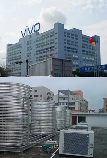 該工程為廣東步步高集團(tuán)vivo員工宿舍熱水項(xiàng)目,為員工宿舍提供洗浴用水,總?cè)沼盟繛?00噸生活熱水。空氣能熱泵熱水器采用特殊高效環(huán)保冷媒,產(chǎn)熱水溫度可達(dá)65℃,工業(yè)用熱泵產(chǎn)熱水溫度最高可達(dá)85℃。常溫下平均熱效率達(dá)460%(最高可達(dá)600%)。同時(shí),空氣能熱泵將消耗的電能轉(zhuǎn)化為4倍以上的熱能,一度電當(dāng)4度電用,實(shí)現(xiàn)制取熱水。