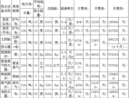 按加熱100噸55℃生活熱水,傳統(tǒng)設(shè)備運(yùn)行一年平均費(fèi)用表(按溫升40℃)