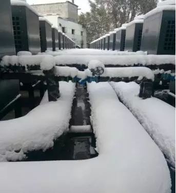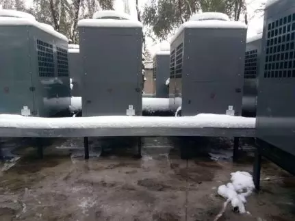 事實勝于雄辯,讓我們通過真實案例來一探究竟。新疆遠離海洋,深居內(nèi)陸,最冷月(1月),平均氣溫在準噶爾盆地為零下20℃以下,該盆地北緣的富蘊縣絕對最低氣溫曾達到零下50.15℃,是全國最冷的地區(qū)之一。而下面這組照片,就是在遙遠的新疆拍攝的。該項目為新源縣聯(lián)誠生態(tài)大酒店有限公司的空氣能熱泵采暖工程項目,采用了正旭的空氣源熱泵來為提供暖氣。