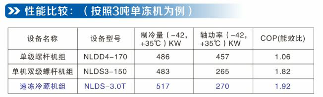 1、節(jié)能效果明顯。速凍冷源機(jī)組高低壓縮比1:3左右,這種配組節(jié)能效果明顯優(yōu)于傳統(tǒng)的(高低壓縮比1:2)單機(jī)雙級(jí)螺桿壓縮機(jī)。比單級(jí)壓縮節(jié)能50%左右。