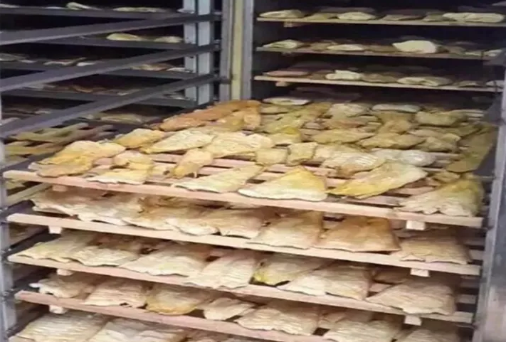 6. 腌制之后,繼續(xù)烘干。將烘干房溫度設為65攝氏度,烘干15小時,連續(xù)排濕,等到茄子含水量達到13%即可,此時茄子顏色變黑褐色可以折斷,但仍為半成品;