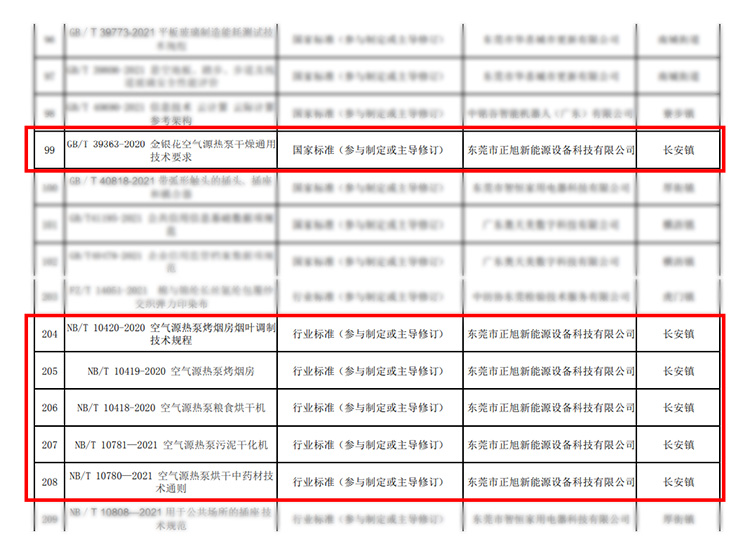 12月5日,東莞市市場監(jiān)督管理局官網(wǎng)發(fā)布了《關(guān)于2022年東莞市促進高質(zhì)量發(fā)展專項資金標(biāo)準(zhǔn)化戰(zhàn)略擬資助項目的通告》,擬對本市符合資助條件的項目進行資助。其中,東莞市正旭新能源設(shè)備科技有限公司憑借參與制定《金銀花空氣源熱泵干燥通過技術(shù)要求》國家標(biāo)準(zhǔn)及《空氣源熱泵烤煙房煙葉調(diào)制技術(shù)規(guī)程》、《空氣源熱泵烤煙房》、《空氣源熱泵糧食烘干機》、《空氣源熱泵污泥干化機》、《空氣源熱泵烘干中藥材技術(shù)通則》五項行業(yè)標(biāo)準(zhǔn)成功入圍。正旭空氣能積極響應(yīng)國家號召,深入貫徹廣東省政府“關(guān)于加快推進質(zhì)量強省建設(shè)的實施方案”精神,以科技創(chuàng)新驅(qū)動新能源行業(yè)高質(zhì)量發(fā)展,在熱泵行業(yè)彰顯正旭擔(dān)當(dāng),貢獻(xiàn)正旭力量。