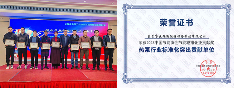 為肯定企業在行業標準化工作中發揮的積極作用,本次會議上表彰了一批熱泵標準化突出貢獻單位和先進個人,東莞市正旭新能源設備科技有限公司榮獲“2023中國節能協會節能減排企業貢獻獎暨熱泵行業標準化突出貢獻單位”,此次獲獎不僅是表彰正旭在行業標準制定上的突出貢獻,也是對正旭多年來堅持節能減排事業、用優質的產品積極響應國家“碳達峰、碳中和”戰略目標的肯定。