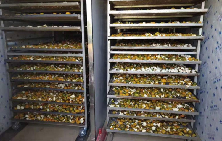 傳統的陳皮干燥采用“三蒸兩曬”的自然曬干法,通常選擇晴朗干燥的天氣,將已翻好的果皮置于曬場內自然干燥。這種方式耗時久,陳皮容易霉變,耗人工,并且陳皮暴露在空氣中容易被灰塵和蠅蟲污染,無法保證食品安全。