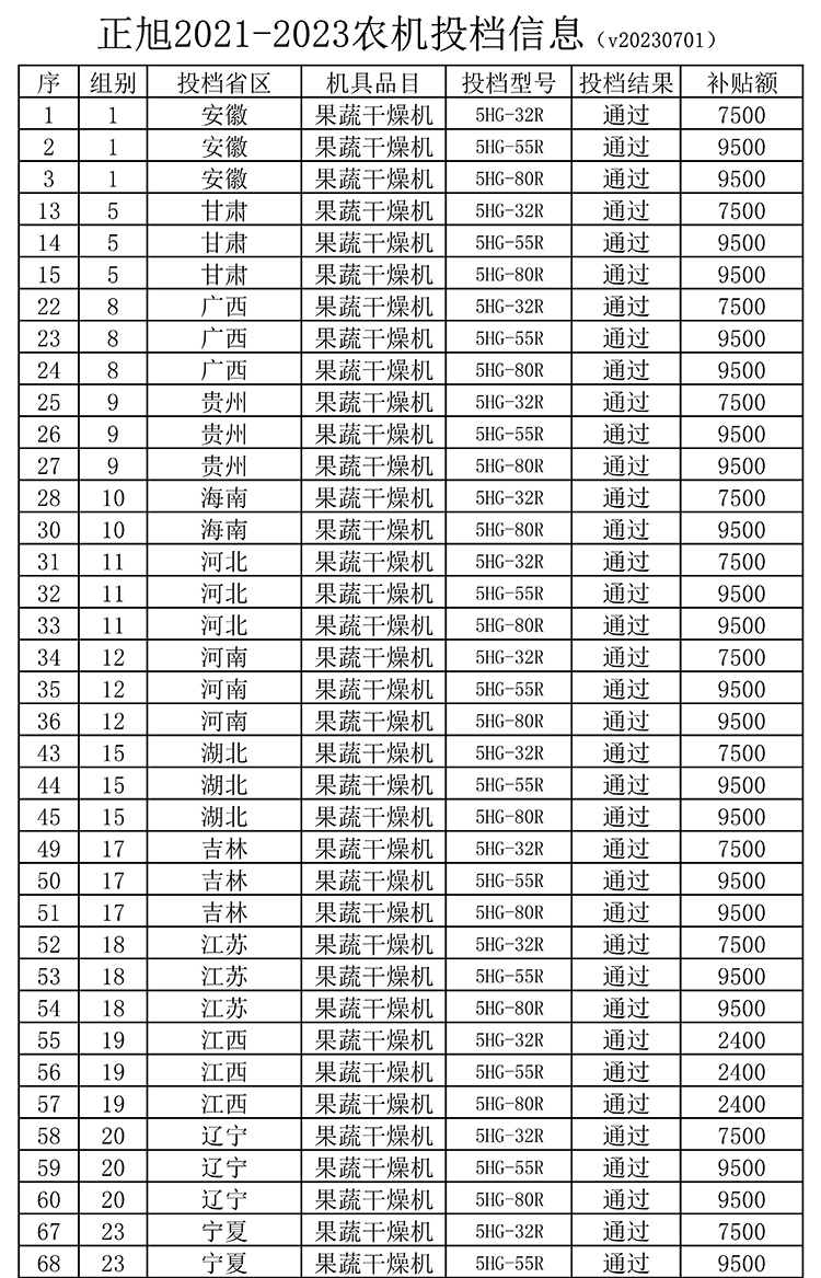 值得一提的是,正旭5HG-32R、5HG-55R、5HG-80R、5HGKB-90A四款果蔬烘干機成功進(jìn)入安徽、甘肅、廣西、貴州、海南、河北、河南、湖北、吉林、江蘇、江西、遼寧、寧夏、青海、山東、山西、陜西、四川、新疆(含新建建設(shè)兵團(tuán))、云南、浙江、重慶22個省市自治區(qū)農(nóng)機補貼目錄,使用正旭熱泵烘干機最高可享受9500元農(nóng)機補貼款,這已是正旭連續(xù)多年進(jìn)入各地農(nóng)機補貼目錄。