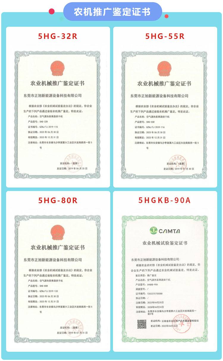 經(jīng)貴州及云南兩省農(nóng)業(yè)機械質(zhì)量鑒定部門對正旭4款果蔬烘干機的容積、功率、干燥能力等參數(shù)嚴(yán)格檢測顯示:正旭5HG-32R、5HG-55R、5HG-80R和5HGKB-90A四款機型均符合DG52/T 030 -2017《果蔬烘干機》的要求,推廣鑒定結(jié)論為通過,并頒發(fā)農(nóng)機推廣鑒定證書。